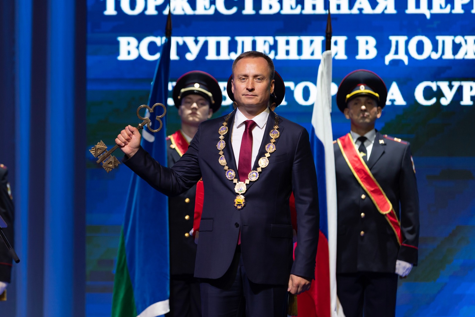 После присяги Александр Олейников вручил Максиму Слепову удостоверение Главы города Сургута и символы власти – должностной знак Главы и символический ключ от города.