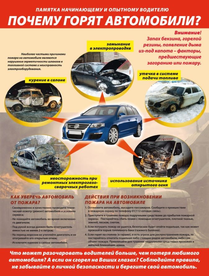 - Помните, что пожар в автомобиле распространяется быстро, за 20 минут легковой автотранспорт сгорает полностью.