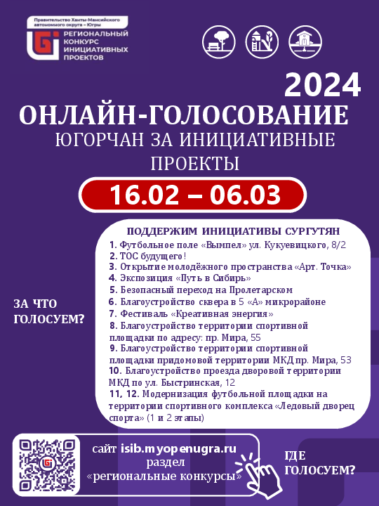 ТОС будущего! ( https://isib.myopenugra.ru/application/view/?id=1081822#vote ); Открытие молодежного пространства «Арт.Точка» ( https://isib.myopenugra.ru/application/view/?id=1081818 ); Экспозиция «Путь в Сибирь» ( https://isib.myopenugra.ru/application/view/?id=1082041 ); Модернизация футбольной площадки на территории спортивного комплекса «Ледовый дворец спорта» 1 этап.» ( https://isib.myopenugra.ru/application/view/?id=1081824#vote ); Модернизация футбольной площадки на территории спортивного комплекса «Ледовый дворец спорта» 2 этап.» ( https://isib.myopenugra.ru/application/view/?id=1081833 ); Безопасный переход на Пролетарском ( https://isib.myopenugra.ru/application/view/?id=1081889#vote ); Футбольное поле «Вымпел» ул. Кукуевицкого 8/2 ( https://isib.myopenugra.ru/application/view/?id=1081925 ); Благоустройство территории спортивной площадки по адресу пр. Мира, 55 ( https://isib.myopenugra.ru/application/view/?id=1081869#vote ); Благоустройство проезда дворовой территории по ул. Быстринская, 12 ( https://isib.myopenugra.ru/application/view/?id=1081855#vote ); Благоустройство сквера в 5 «А» микрорайоне» ( https://isib.myopenugra.ru/application/view/?id=1081827 ); Фестиваль «Креативная энергия» ( https://isib.myopenugra.ru/application/view/?id=1081848#vote ); Благоустройство территории спортивной площадки придомовой территории МКД пр. Мира, 53 ( https://isib.myopenugra.ru/application/view/?id=1081972 ).